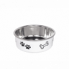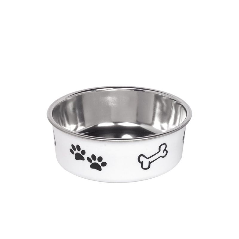 Miska na psy "Fusion" z nehrdzavejúcej ocele a plastu je doplnená o motív labiek a kostičiek. Vďaka pevne pripojenému gumovému krúžku na spodnej časti je miska nekĺzavá a je vhodná do umývačky. Je k dispozícii v troch veľkostiach a štyroch farbách a je ideálna ako vkusný doplnok do domova.