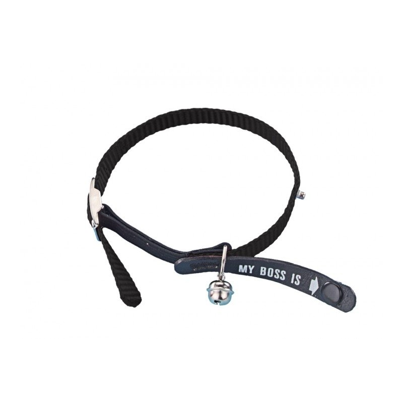Obojok pre mačku Nobby My Boss is v čiernej farbe s hladkým okrajom, rolničkou a popísatelným koženým pásikom (adresár) .
