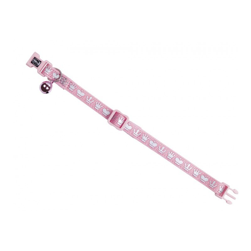 Obojok pre mačku Nobby Royale v ružovej farbe so vzorom korún a rolničkou.