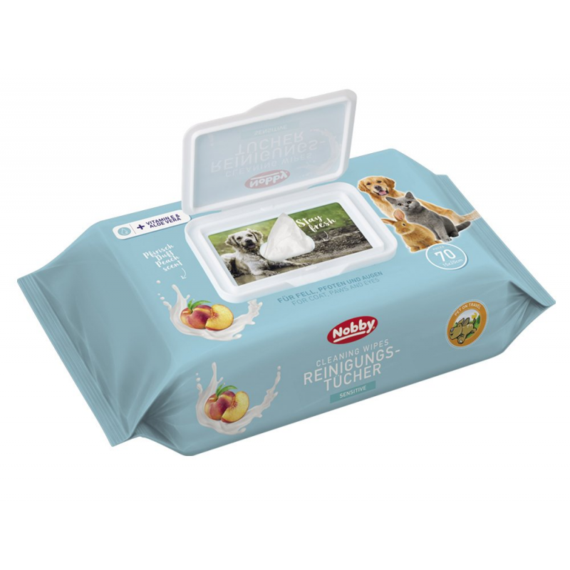 Šetrné vlhčené obrúsky Nobby pre psov a mačky v praktickej uzatvárateľnej plastovej dóze. S jemnou vôňou broskýň. Obzvlášť jemné vďaka vitamínu E a extraktu AloeVera.