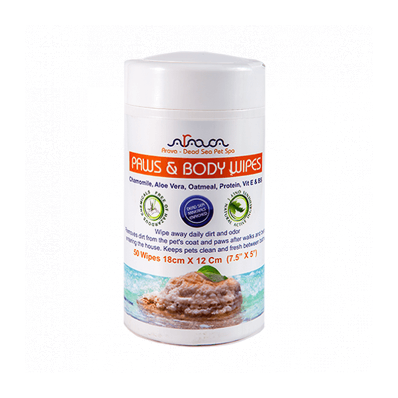 Vlhčené bylinné utierky na labky a telo izraelskej značky Arava majú prémiové zloženie a sú obohatené o 26 minerálov, ktoré pochádzajú z Mŕtveho mora, vitamín E, B5, harmanček, aloe vera, ovos a ďalšie prírodné zložky, ktoré priaznivo pôsobia na telo zvieratka.