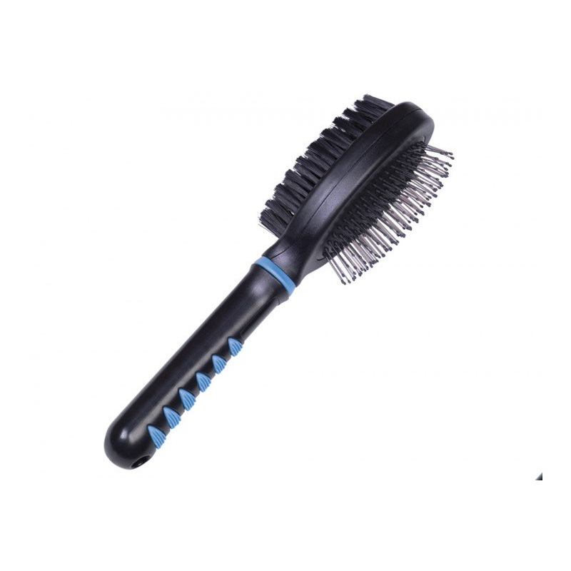 Táto obojstranná univerzálna kefa, pozostávajúca z oceľovej kefy a kefy s nylonovými štetinami, je vhodná pre všetky psy a mačky. Oceľová kefa (štetiny s plastovou ochranou) masíruje pokožku a podporuje krvný obeh. Nylonová kefa zaisťuje čistú, lesklú srsť. Plastová rukoväť je v ruke bezpečná a pohodlná a zaisťuje pohodlné čistenie.